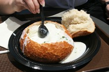 Ausgehöhlt und mit Clamchowder - einer Muschelsuppe - gefüllt, wird es zu einer leckeren Spezialität in San Francisco. Miam!!