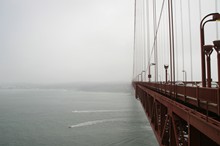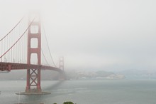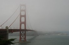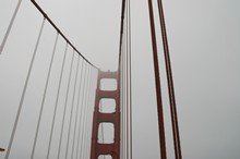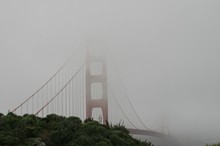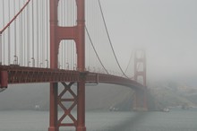 Das 'international orange', mit dem die Brücke gestrichen ist, soll in der Sonne golden leuchten. Wir können das leider nicht bestätigen, denn die Sonne hat es bisher noch nicht geschafft, die Wolken, die unaufhörlich vom Wind in die Bucht getrieben werden bis hierher zu verdampfen.